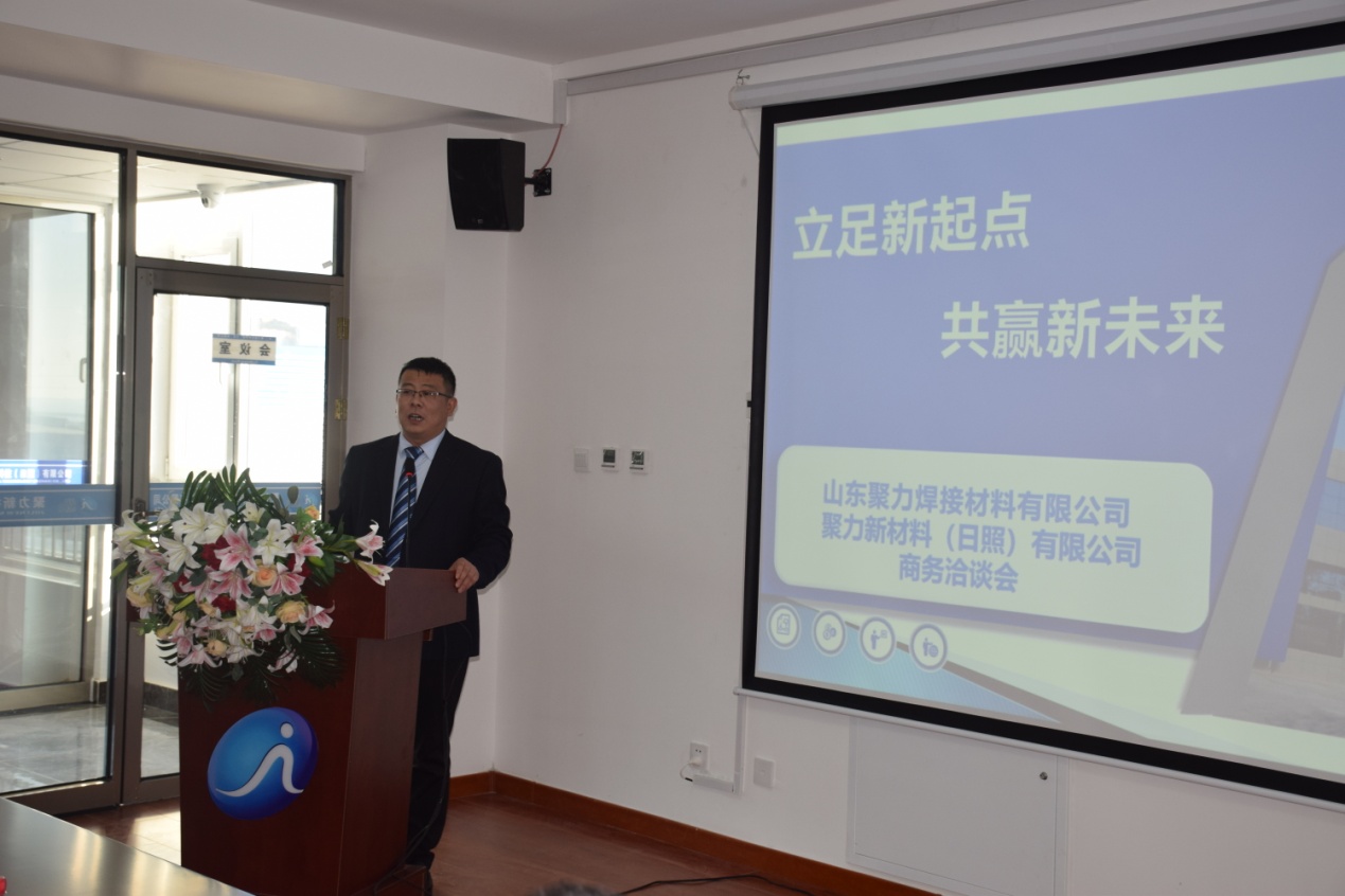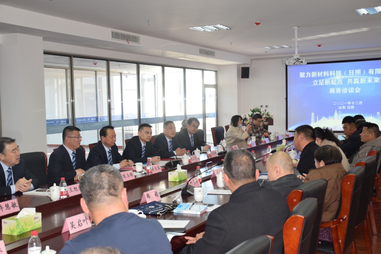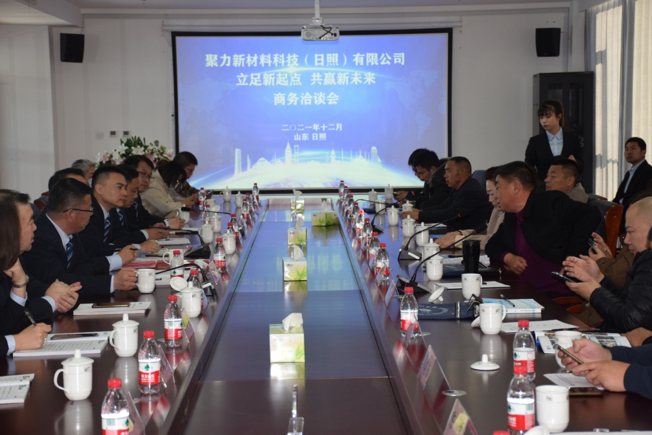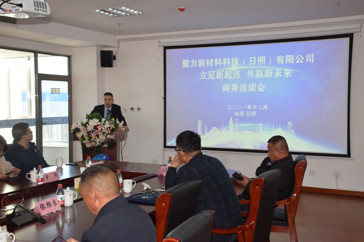 2021年12月13日上午9点,聚力新材料科技(日照)有限公司“立足新起点、共赢新未来”商务洽谈会在聚力日照公司新落成投入使用的办公大楼准时召开,会议由公司副总经理高云飞主持,公司副董事长、日照公司总经理乔吉春致欢迎词。